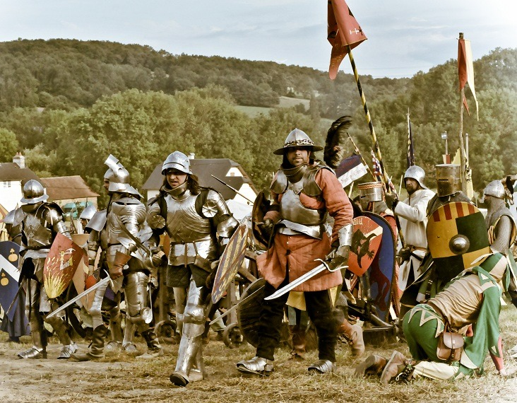 De l’autre côté de la Manche, justement, Henri de Lancastre force son cousin le roi à abdiquer et monte sur le trône en 1399 sous le nom d’Henri IV d’Angleterre. Il réaffirme aussitôt ses prétentions sur la France. Son fils, Henri V débarque en Normandie en 1415.Les combats reprennent dans une France déchirée. D’un côté, les archers anglais démontrent définitivement l’efficacité de leurs armes de jet contre les chevaliers. L’armée française est vaincue et le duc d’Orléans, neveu du roi et protégé des Armagnacs, est capturé. Les Bourguignons en profitent pour massacrer leurs ennemis à Paris sans se préoccuper de l’avancée anglaise. Malgré la riposte de l’Armagnac et l’assassinat de Jean-Sans-Peur, il faut négocier avec les Anglais. Ainsi, le traité de Troyes signé en mai 1420, fait d’Henri V le gendre de Charles VI et son héritier. Après la mort de son père en 1422, le régent anglais fait couronner Henri IV roi de France. La guerre prend fin sous le règne de Charles VII, fils de Charles VI, qui revendique dès 1422 le trône pour lui. Le traité de Troyes n’est reconnu que par les régions du Nord de la Loire, et l’entreprise anglaise est vite stoppée. La plus célèbre des partisans de Charles VII, Jeanne d’Arc, refoule l’armée d’Henri VI à Orléans, le 4 mai 1429. Le nouveau roi est sacré à Reims le 17 juillet de la même année. Malgré la capture de Jeanne d’Arc par les Bourguignons, sa vente aux Anglais et son exécution en mai 1431, la France regagne tous ses territoires. Privés du soutien des Bourguignons qui ont conclu une paix avec Charles VII en 1435, les Anglais abandonnent Paris, la Normandie et, finalement, l’Aquitaine en 1453. Seule la ville de Calais reste sous leur contrôle jusqu’en 1558. Ainsi, sans qu’aucune paix soit signée, la guerre commencée cent-seize ans plus tôt prend fin cette même année 1453. »